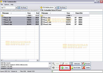 5)Luego hacer doble click sobre la nueva carpeta, buscar en la mitad izquierda de la pantalla en que parte de la computadora tenemos guardados los archivos .dat y el archivo .ski del skin que queremos cargar. Una vez encontrados los seleccionamos y apretamos el boton "copy"